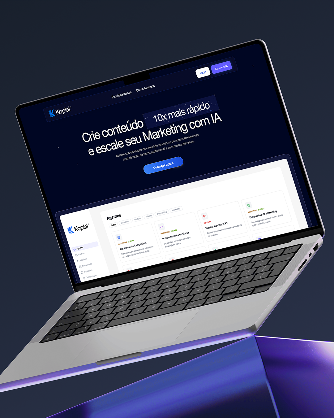 A Koplai nasceu dentro de uma operação real de marketing com o objetivo de centralizar e acelerar toda a produção de conteúdo, transformando tarefas dispersas em um fluxo único, rápido e orientado à performance. O desafio da marca não era criar um software — era se destacar em um mercado saturado e previsível, chegando com clareza de posicionamento e transmitindo modernidade, agilidade e acessibilidade. O trabalho foi pautado em três pilares: posicionamento estratégico, acessibilidade e diferenciação. A Koplai foi posicionada como uma solução clara, intuitiva e orientada à performance, com foco em agências de marketing e criadores de conteúdo jovens que buscam velocidade e familiaridade com tecnologia. O logotipo representa simultaneamente a letra K e um livro aberto em movimento, simbolizando conhecimento, evolução e novas oportunidades.